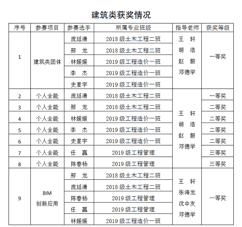 学校土木工程学院和智能制造工程学院积极组织,自2021年3月开始动员学生报名,4月组织校级比赛,5月28日分别遴选了学生组成队伍参加重庆市赛。在市赛取得优异成绩的土木工程学院7名学生和智能制造工程学院9名学生,进行了为期一个月的集中训练,经过决赛角逐,最终荣获全国大赛建筑类团体一等奖1项,BIM创新应用一等奖1项,个人全能一等奖1项、二等奖4项、三等奖2项;荣获全国大赛机械类团体二等奖1项,制图基础知识三等奖1项,个人全能一等奖1项、二等奖4项、三等奖2项。