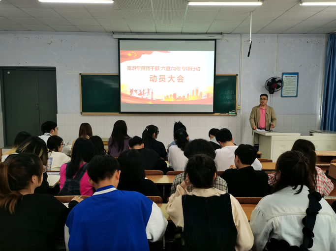 在中国共青团成立100周年之际,为了深入学习贯彻习近平总书记对共青团干部提出的系列重要要求,积极落实共青团中央《新时代全面从严治团实施纲要》《关于提高政治站位改进工作作风的六条规定》精神,旅游学院于4月12日在星湖校区第七阶梯教室举行了团干部“六查六问”专项行动动员大会,两委会主席团成员及团总支全体干部参加了本次大会。会议由团总支书记秦荣廷主持。