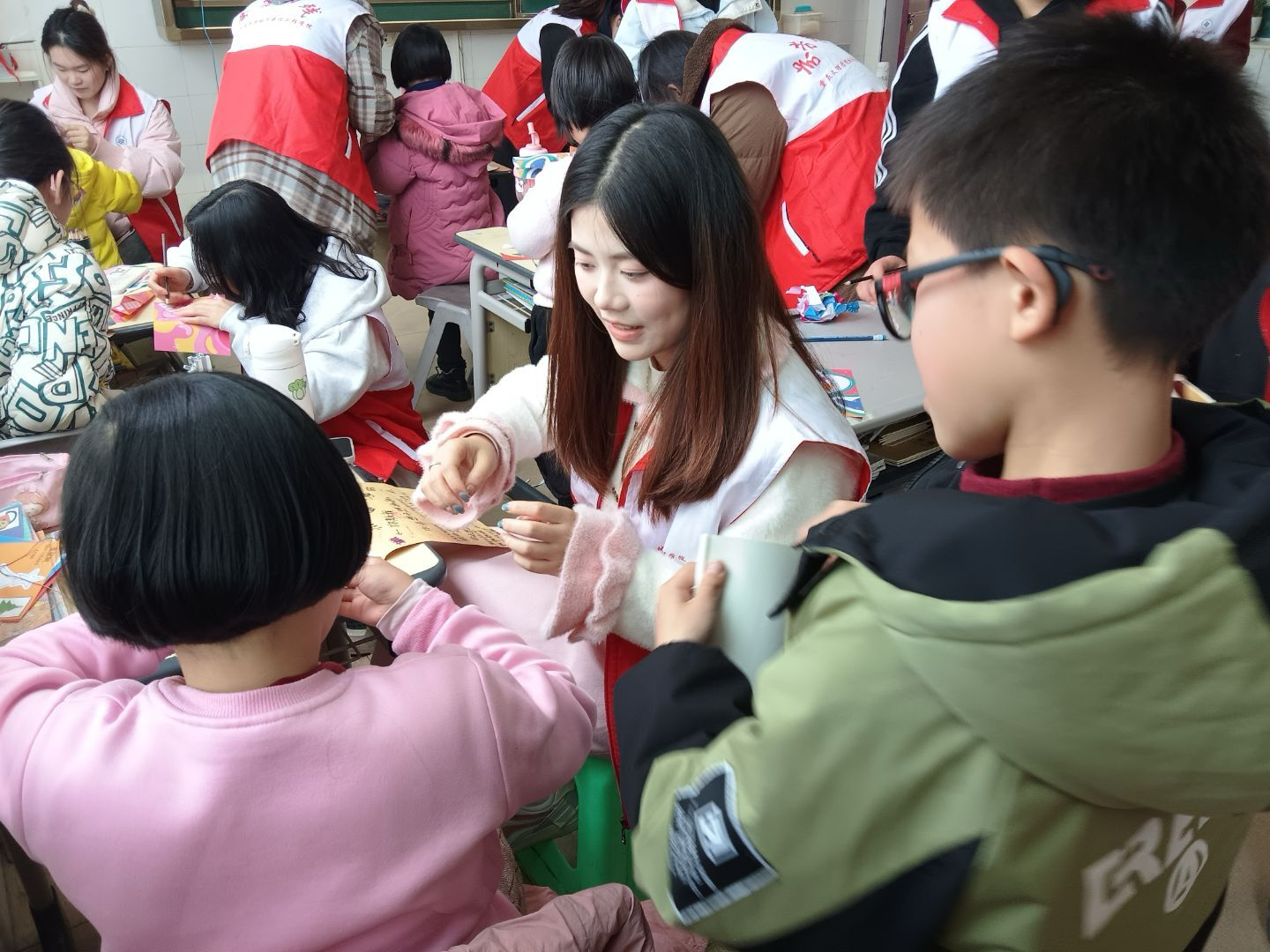 制作折纸飞机的环节,在志愿者的帮助下,孩子们一起折纸飞机,体验了折纸艺术的乐趣和成就感。通过这一简单有趣的活动,孩子们不仅锻炼了动手能力,也在互动中感受到了雷锋精神所蕴含的友爱与关怀。